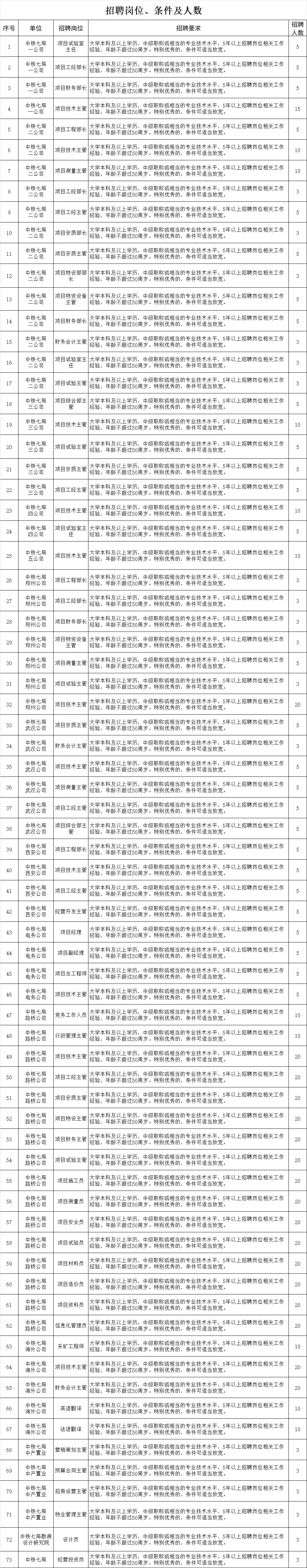 因生產(chǎn)經(jīng)營及發(fā)展需要,中鐵七局及所屬各單位現(xiàn)面向社會公開招聘經(jīng)營管理和專業(yè)技術人才。具體事宜如下: