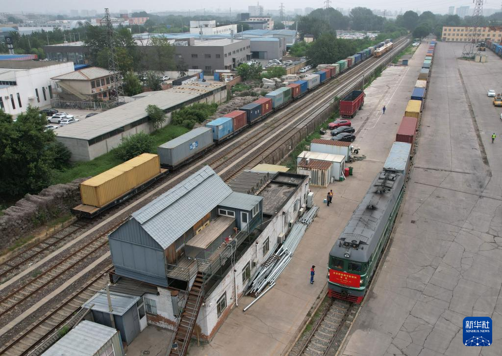 6月30日,北京至阿塞拜疆巴庫的跨里海中歐班列??吭谖挥诒本┦蟹可絽^(qū)的北京國(guó)際陸港等待發(fā)車(無人機(jī)照片)。