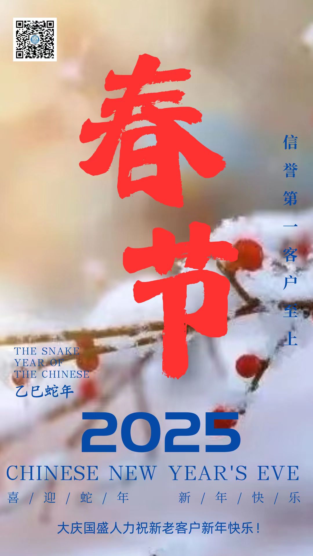 鞭炮聲聲,喚醒了沉睡的新年;瑞雪飄飄,帶來了新春的祝福。在這辭舊迎新的美好時(shí)刻,大慶市國盛人力資源管理有限公司向一直以來支持和信任我們的客戶、合作伙伴,以及每一位關(guān)注我們的朋友,致以最誠摯的新年祝福!